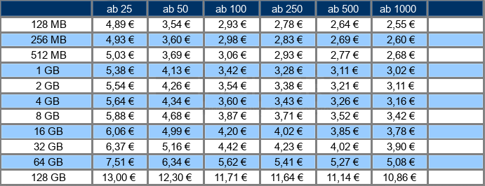 Preise je USB-Stick - inkl. einem einseitigen 1-farbigen Druck oder einer Lasergravur. - inkl. Drucknebenkosten und Einrichtungskosten. - inkl. GEMA-Gebühr Preise gelten für Lieferung in Deutschland. Preise für Lieferung ins Ausland auf Anfrage. |